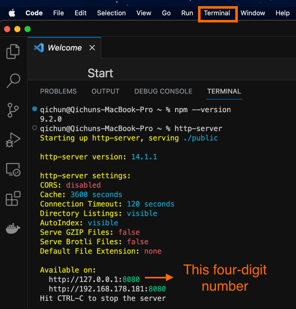 Step 2: in VS Code, click “New Terminal” under “Terminal“, then type the following commands: