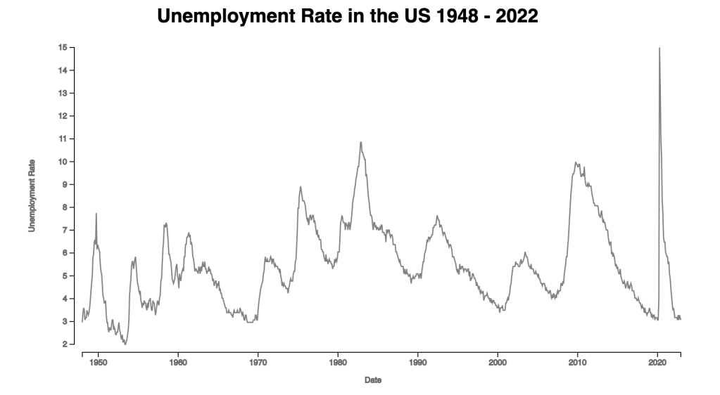 Here we have the simple line chart. The unemployment rate is really high when covid started in the United States.