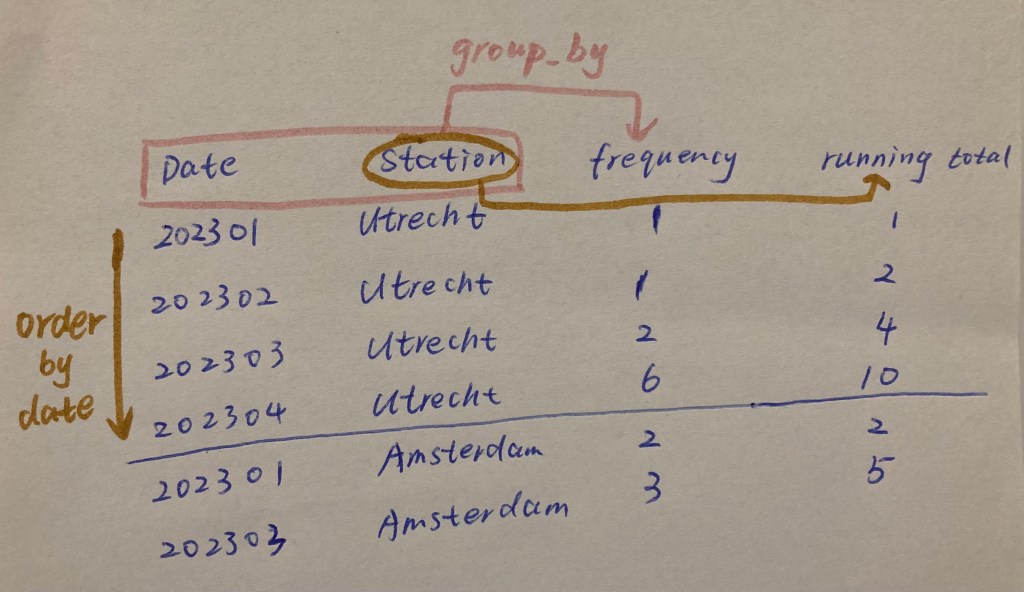 To solve this, I created a cross-join table with all the stations and all the months. If I didn’t visit a station, the frequency should be 0, and the running total will stay the same.