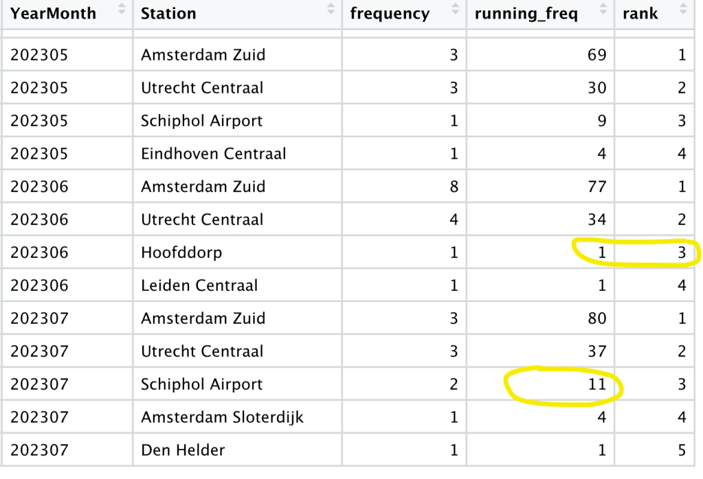 When I implement the idea, I noticed a problem. If I didn’t visit a station that month, it is not in the table below. For example, I didn’t visit Schiphol Airport in June, Hoofddorp is ranked third. But it should be Schiphol Airport or probably another station not being visited that month. If you look at the picture above, Amsterdam is not visited in 202302, then this month will be missing in the final table.