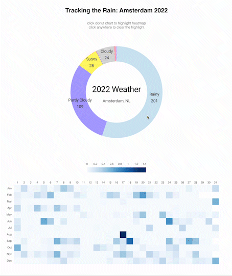 Today I combined two of my previous charts and made a dashboard with interactions. When you click on the donut chart, it will highlight the days in the heatmap. This is achieved by binding the d.icon with both the donut chart and the heatmap.